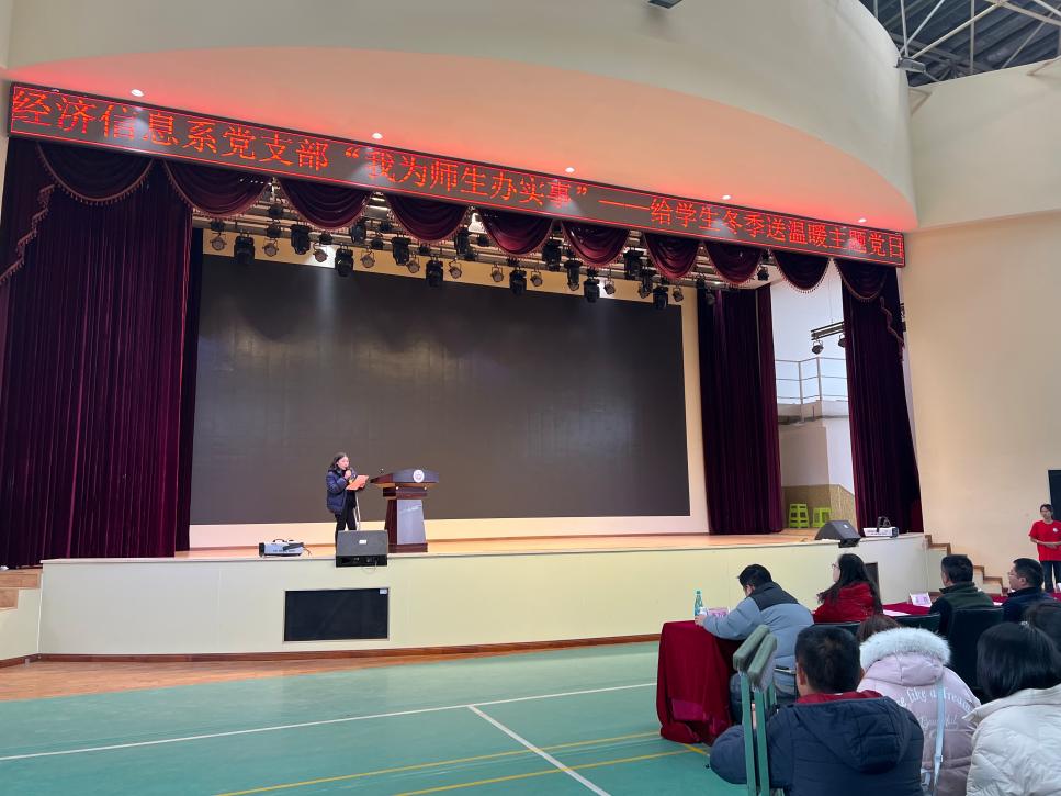 支部书记高翠在活动开始前发表讲话,她说,经济系信息党支部为帮助学生解决实际生活困难,顺利御寒过冬,传递学院和支部对学生的关心和爱护,让学生真切感受到经济信息系大家庭的温暖,特开展此次送温暖活动。她希望同学们克服困难,努力学习,不辜负学校和老师的期望与关爱。积极进取,把学校给予大家的爱相互传递,让更多人感受到温暖,尽自己最大的力量为社会多做贡献。