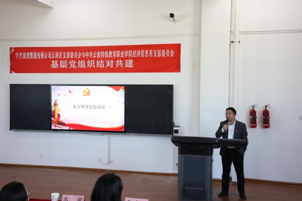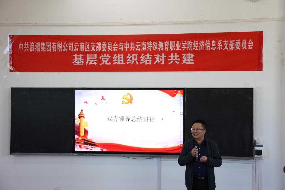 在活动尾声,双方领导进行了总结讲话。云南浪潮王文武同志表示:非常高兴与经济信息系党支部的合作共建,此次的支部共建不是终点,而是起点,希望通过支部共建活动,构建起“资源共享、优势互补、互相促进、共同提高”的校企党建共建新格局。董亮同志表示:要围绕立德树人根本任务,将支部基层建设与业务发展相融合,建立校企产教融合、专业发展、人才交流,形成双方资源共享、互惠双赢、共同发展的良好合作关系。希望双方坚持“以共建促党建、共建促合作、共建促发展”的原则,加强党建合作,进一步提升校企双方党建工作水平,真正实现校企在党建、业务方面的“双共建双促进”。