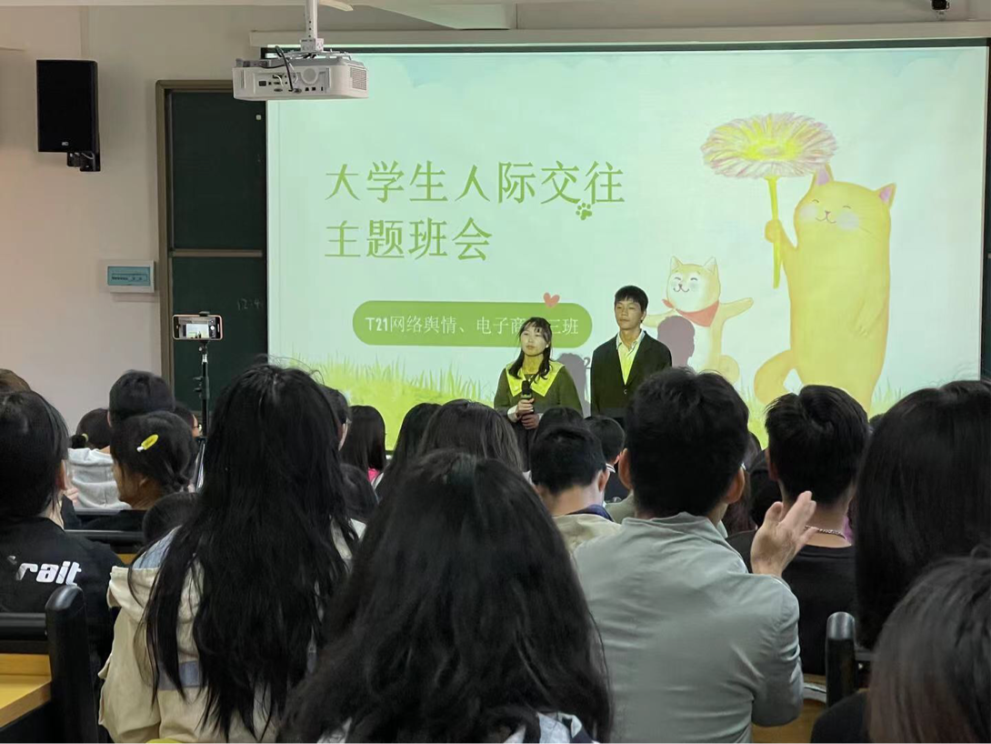经经济信息系辅导员工作会议决定,李娴老师所带班级T21网络舆情监测班和T21电子商务三班,于2021年11月5日下午16点在实训楼309合班召开大学生人际交往主题教育班会,本次参会有经济信息系党支部副书记王小川老师、经济信息系全体专兼职辅导员、T21网络舆情监测和T21电子商务三班全体同学、以及经济系信系中专和大专部分学生代表,特别邀请了特教系辅导员代表史洋老师、艺术系辅导员代表杨崇方老师。