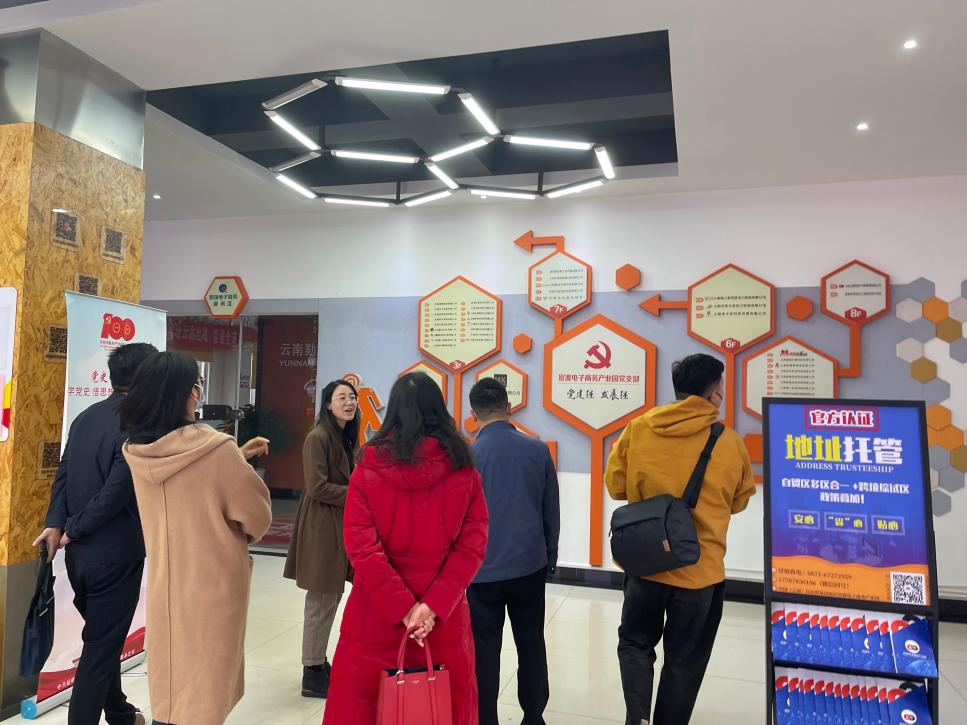 董亮一行人先后参观了园区各家入驻公司(阿里巴巴本地商业发展部、云南勤思电子商务有限公司、云南敏学科技有限公司、云南方旭贸易有限公司、云南梵喜礼品有限公司等),对电子商务园区内的党建工作、运营模式、前后端工作环境等进行了详细的了解。随后双方进行了深入的座谈,园区负责人陈苇对园区的总体情况进行了介绍,表示有意与学院进行合作,同时重点提出目前企业校招工作中的最大问题是:岗位需求和学生到岗能力之间的脱节问题。董亮对此问题进行了针对性回答,强调了校企合作的主要目的就是解决脱节问题,加强人才培养的合作。经济信息系主任高翠介绍了经济信息系学生基本情况,专业建设现状和发展规划,希望双方能够深入探索,在专业、实践实习、师资提升等方面展开合作共建。刘亚彬表示此次调研增强了学院与企业之间的相互联系,汲取了宝贵的经验,加强了校企合作,对学院进一步改进人才培养方案和实习就业模式起到了积极推动作用,并对学生全方位职业生涯培养提出了建设性意见。