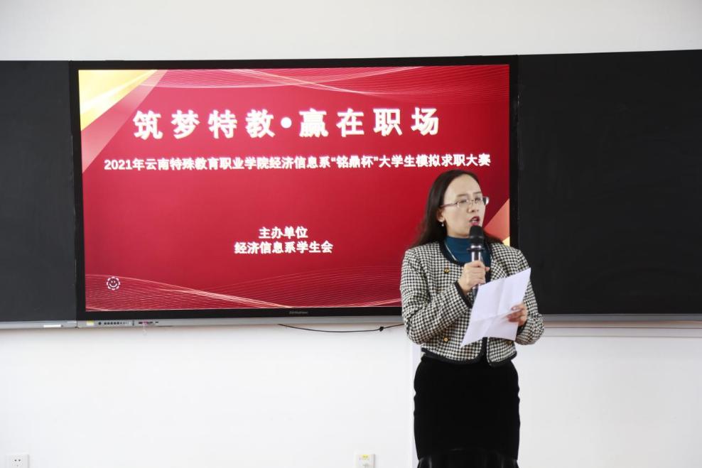 为贯彻党中央、国务院和省委、省政府关于做好“六稳”落实”六保”任务的决策部署,按照云南省教育厅、云南省人力资源和社会保障厅文件要求,积极响应学院号召,为了做好我系就业指导工作,加大就业服务工作力度2021年11月2日,经济信息系玉璋楼408举行筑梦特教赢在职场”2021年“铭鼎杯”大学生模拟求职大赛初赛。大赛邀请了沃尔玛昆明大区人事经理杨丽,昆明易桥职业培训学校校长李林,宁美有限公司昆明分公司总经理赵燕,小善科技人事主管丁凤、人事专员罗江超,经济信息系党支部副书记王小川担任此次大赛的评委。经济信息系党支部书记兼系主任高翠,经济信息系团总支书记郜锐,特教系团总支书记史洋及我系2020级、2021级学生代表到现场观赛。