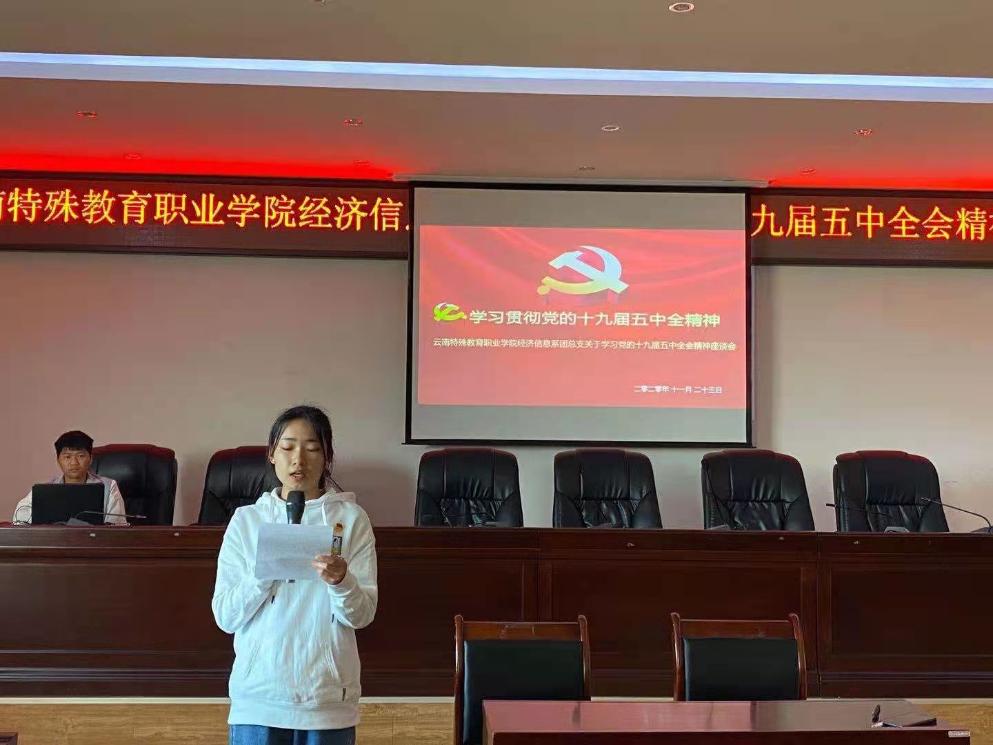 根据共青团中央印发《关于认真学习宣传贯彻党的十九届五中全会精神的通知》和《共青团ac米兰官网中文网站委员会关于组织团支部会议集中学习党的十九届五中全会精神的通知》的文件要求,对全团学习宣传贯彻全会精神做出部署,明确要求以团支部为主要方式组织开展学习。经济信息系团总支高度重视,将组织团支部开展学习作为一项重要政治任务,11月23日开始,开展“学习贯彻党的十九届五中全会精神”系列活动。参加此次座谈会的有经济信息系党支部副书记、系主任高翠同志,支部组织委员、团总支书记陶柯妤同志,6名团总支委员及各班团员代表。