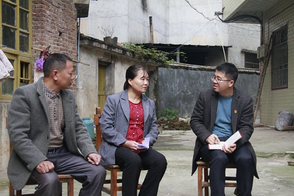 图为邓庭云(右)在广发镇忠良村核查困难群众房屋修缮相关问题线索。资料图片