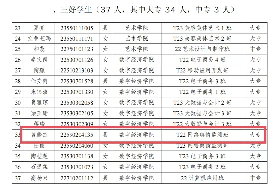 曾麟杰同学自入学以来,始终以高度的责任感和使命感严格要求自己,展现出全面发展的优秀品质。其辅导员这样评价:“作为多项职务的担当者,他将一腔热忱化作连廊桥积极参与到社会实践服务活动中”。工作中,他积极进取,活动中,他以较强的组织协调能力,为学校、为同学们热情服务,赢得了师生的广泛赞誉。从教室到社区,他的成长轨迹恰似拔节青竹,既有向下扎根的沉淀,更显向上生长的力量。