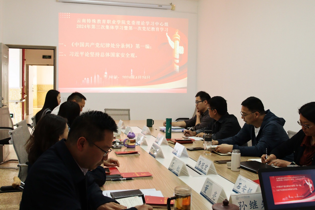 4月24日,ac米兰官网中文网站党委理论学习中心组开展2024年第三次集体学习暨第一次党纪教育学习,会议围绕《中国共产党纪律处分条例》第一编、习近平论坚持总体国家安全观展开学习。党委书记孙继先逐条领学并解释说明,党委副书记、校长董亮作学习交流发言。
