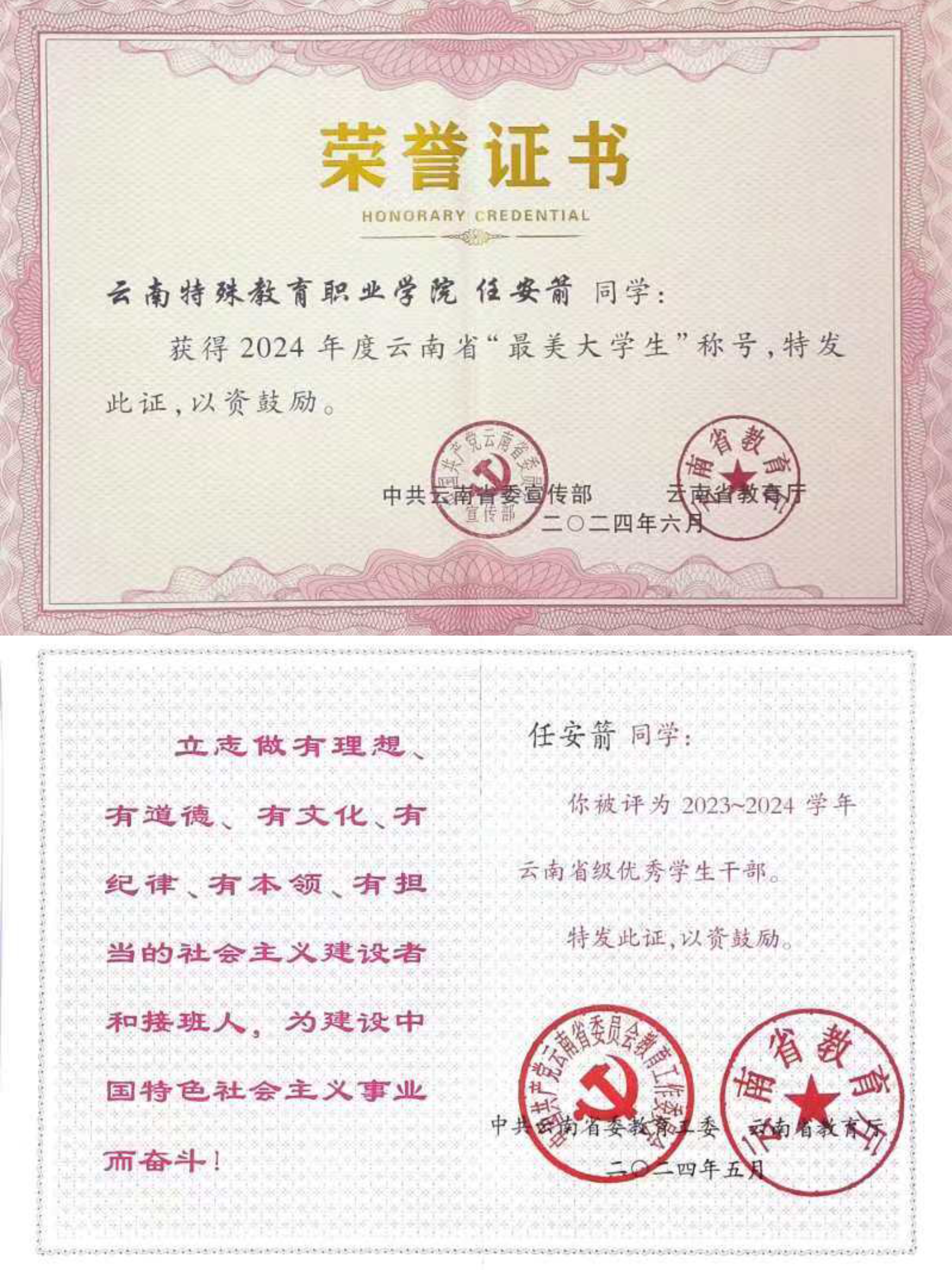 2022-2024年对他来说,是收获的年份,多年的坚持和努力付出,都在这一年开始回报。2022年他通过了云南省硬笔书法协会的测试,取得了入会资格,还获得了中华经典诵写讲大赛“笔墨中国”汉字书写大赛的省赛二等奖和国赛三等奖,在第八届“西湖之春”全国青少年书法大赛中获得了银奖。2024年他还获得2024年度云南省“最美大学生”称号;“云南省级优秀学生干部”等荣誉称号。2023年首届职规大赛在校内启动,在备赛期间,任安箭同学得到了指导老师郜锐的悉心指导和鼓励,同时也得到了系部和学校的大力支持。经过校内的层层选拔,任安箭和其他几位优秀的队友一起进入了云南省分赛区的比赛,并取得了省赛金奖的优异成绩,成功晋级全国总决赛。