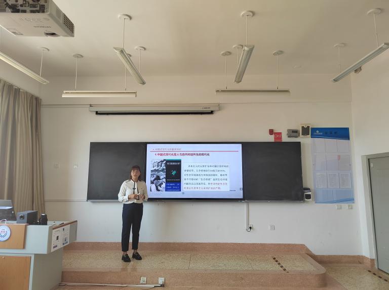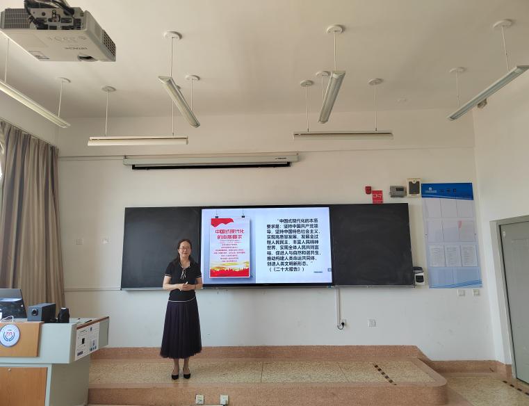王丽萍、柳琴、刘安惠、杨宗源、陈金艳、王乃荣六位老师分别选取《习近平新时代中国特色社会主义思想概论》和《思想道德与法治》知识点进行时长20分钟的教学展示。六位老师认真备课,用心设计和打磨课件讲课稿,选取生动的、贴近学生生活的教学案例,准备丰富扎实的教学内容,展示了马院教师的风采。