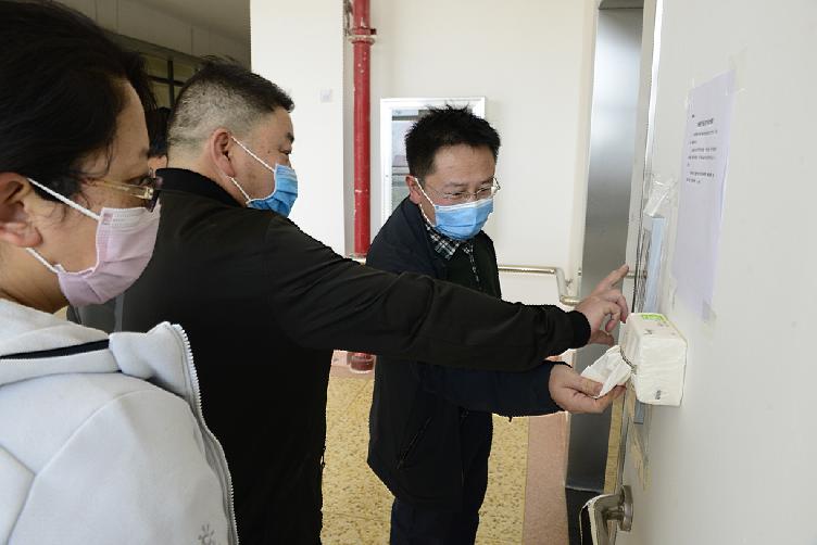 图为检查电梯消毒和防疫物资配备情况