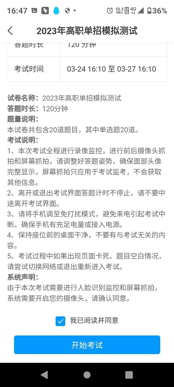 勾选“我已阅读并同意”后点击“开始考试”。选择好试卷点击进入考试界面,进行试卷作答,作答结束再仔细检查有无遗漏,没有即可点击交卷,确定交卷完成考试。