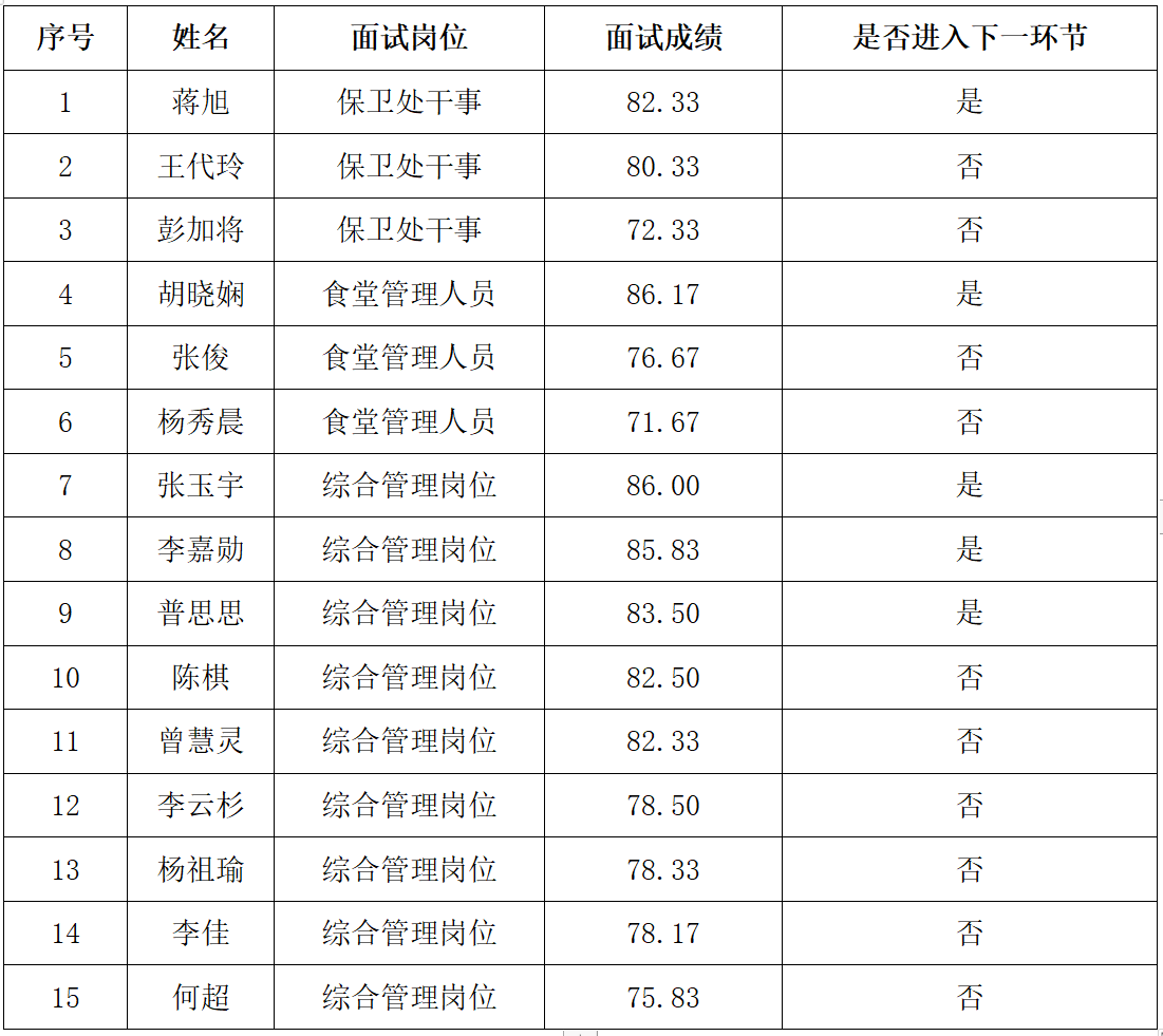 根据《ac米兰官网中文网站2024年招聘编制外工作人员公告》有关规定,本次招聘编制外工作人员的面试环节已经结束,现将面试成绩公示如下: