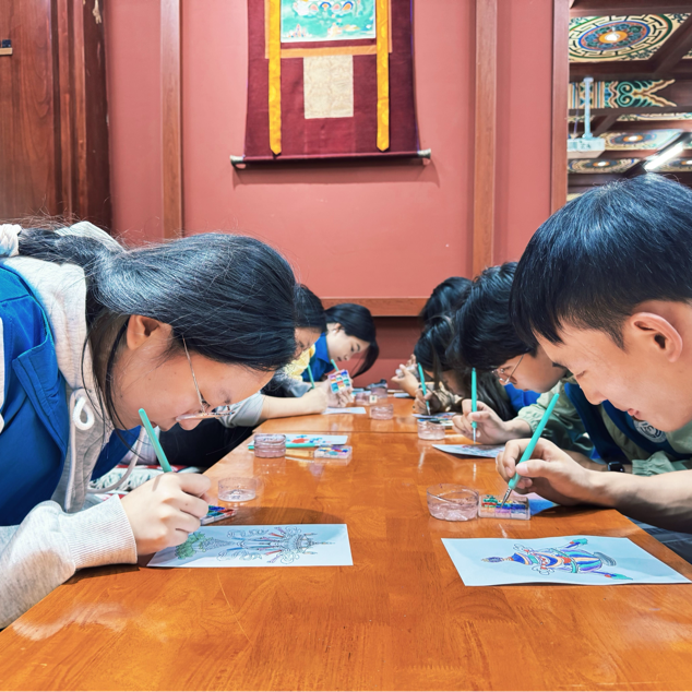 走进迪庆州博物馆与古城非遗体验中心,唐卡的绚丽色彩、藏香的氤氲药香让师生沉醉。在非遗传承人指导下,实践团队师生亲手参与藏香制作,体验手绘唐卡纹样。“每一笔金线都象征民族团结的金纽带”,实践团队成员在唐卡上绘出石榴图案。
