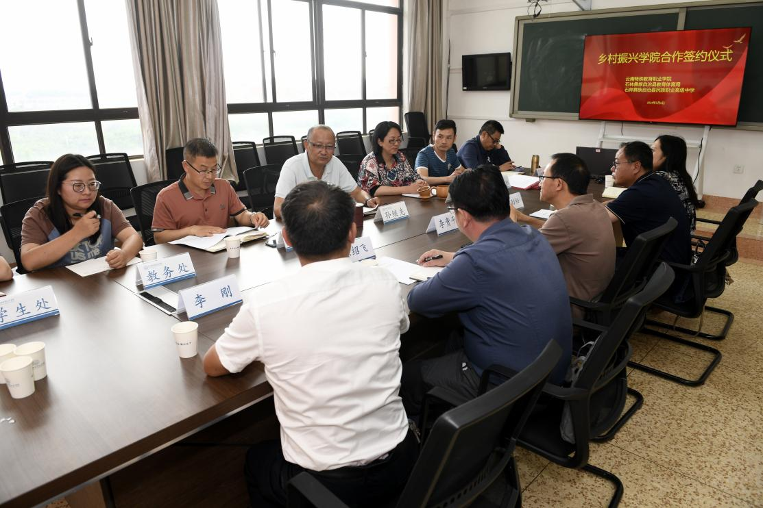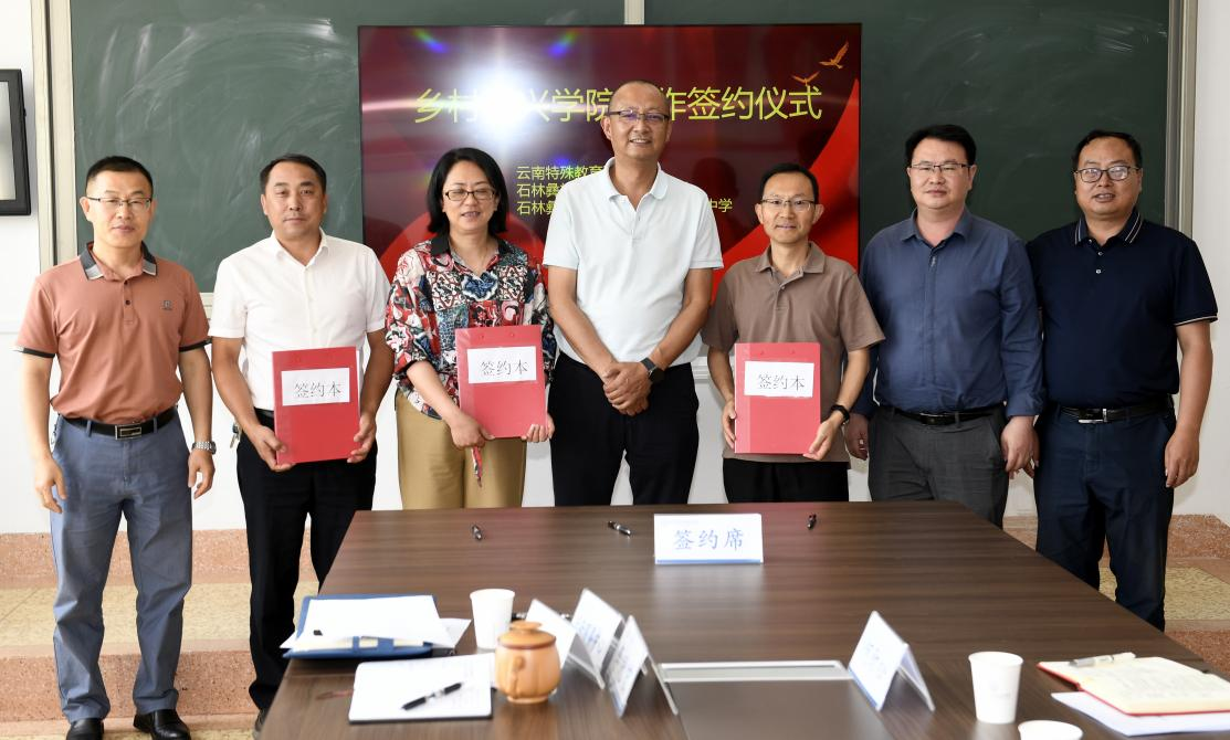 为深入贯彻落实国家发展改革委等8部门联合印发的《职业教育产教融合赋能提升行动实施方案(2023-2025年)》《云南省教育高质发展三年行动计划(2023-2025)》和《云南省特殊教育“十四五”发展提升行动方案》文件精神,促进教育和产业统筹融合、良性互动,推动云南教育高质量发展,学校与石林县教育体育局、石林县民族职业高级中学积极探索举办“高职院校+县级政府+县级职中”乡村振兴学院。乡村振兴学院合作签约仪式于5月6日在ac米兰官网中文网站举行,ac米兰党委书记孙继先,党委委员、副校长李冠宏,党委委员、副校长李永芳,相关部门人员和石林县教育体育局局长李贵平,党组成员、副局长陈绍飞以及石林县民族职业高级中学党支部书记何劲松、校长李刚、办公室主任丁耘等出席签约仪式。