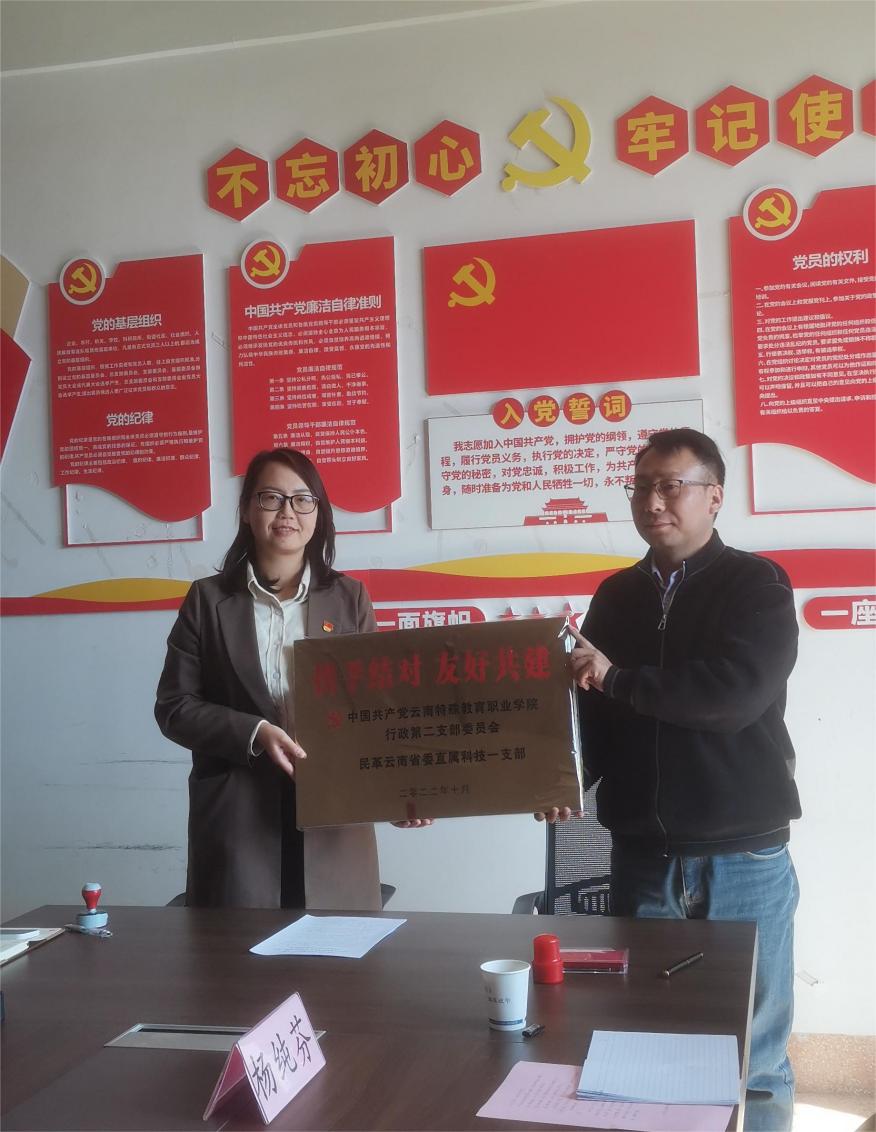 2022年10月19日下午,中共ac米兰官网中文网站行政二支部与民革云南省委直属科技一支部在ac米兰官网中文网站内开展联合共建活动,主要任务是通过支部共建,相互促进、友好合作、资源共享,充分发挥双方扶残助残的社会服务职能,为云南的特殊教育高等教育事业谱写更华丽的篇章。
