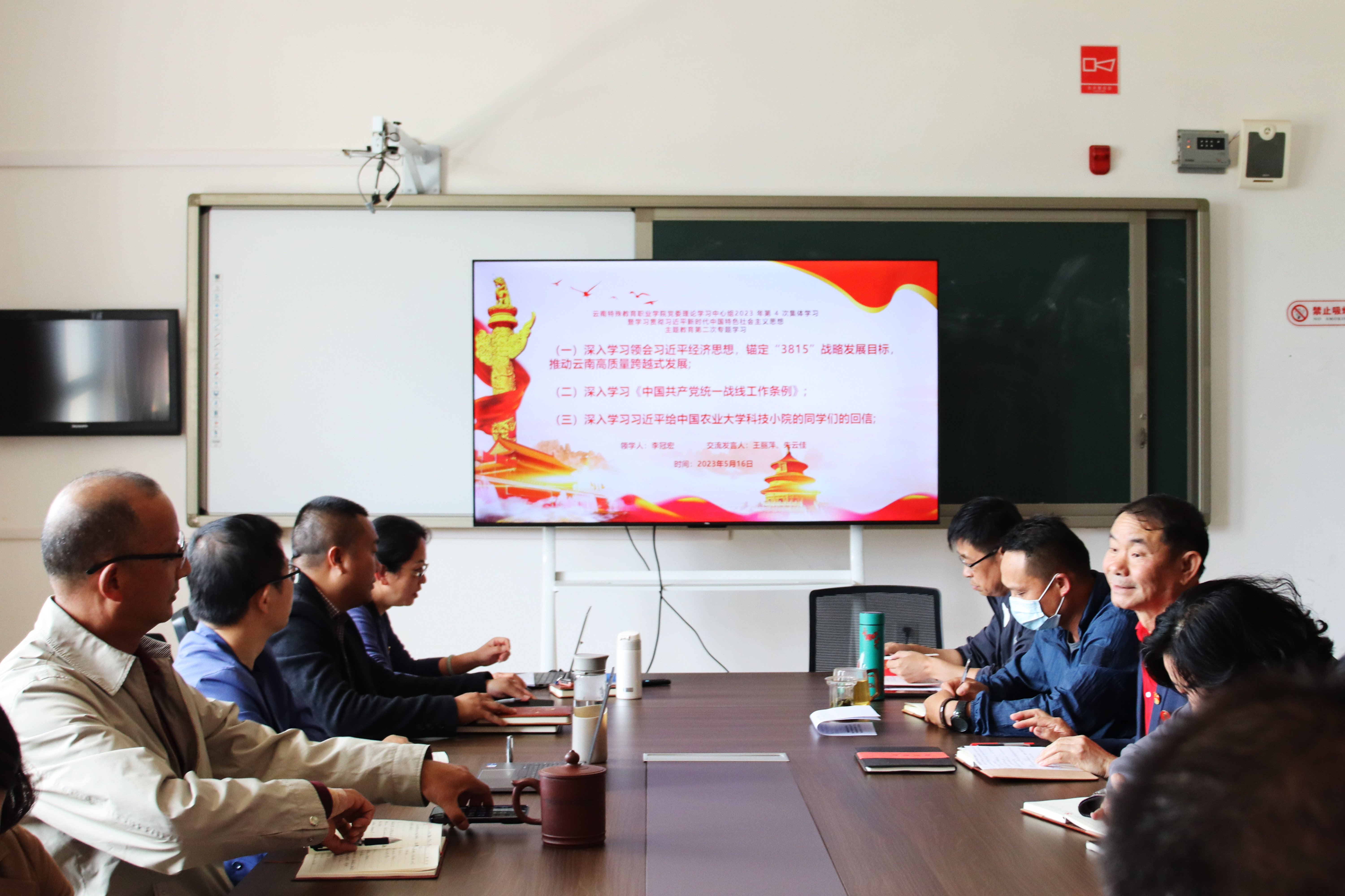 2023年5月16日,ac米兰官网中文网站党委理论学习中心组举行2023年第4次集体中学习会暨学习贯彻习近平新时代中国特色社会主义思想主题教育第二次专题学习,学习内容为领会习近平经济思想,锚定“3815”战略发展目标,推动云南高质量跨越式发展,《中国共产党统一战线工作条例》,习近平给中国农业大学科技小院的同学们的回信。