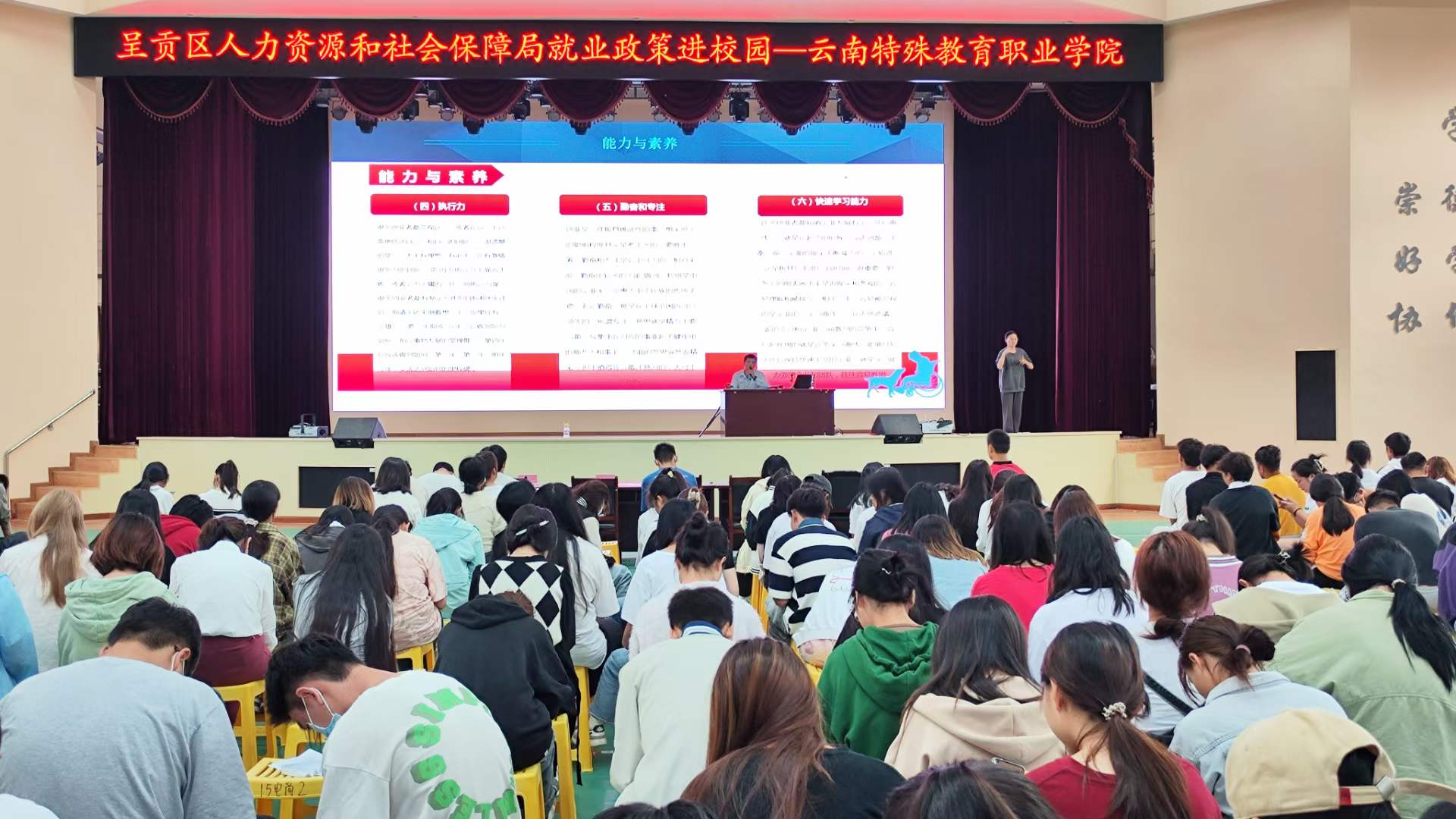 在学校礼堂,呈贡区人社局副局长黄婕向在座的学生详细介绍了高校毕业生就业总体形势,云南省、昆明市重点发展产业和就业创业政策,以及呈贡区鼓励高校毕业生就业创业政策及典型案例。分析了当前毕业生就业创业面临的激烈竞争和有利机遇,鼓励毕业生主动了解政策、用好政策,实现自己的人生目标。