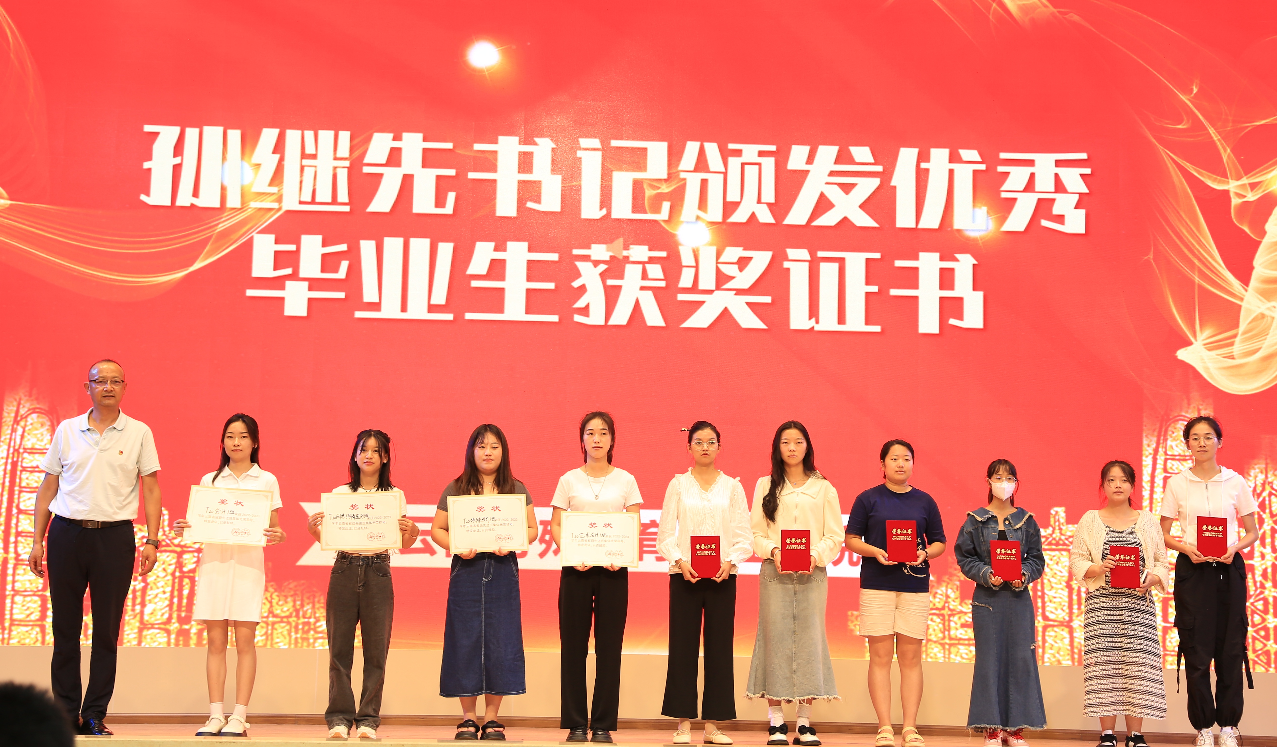 党委书记孙继先为毕业生代表颁发奖状及证书
