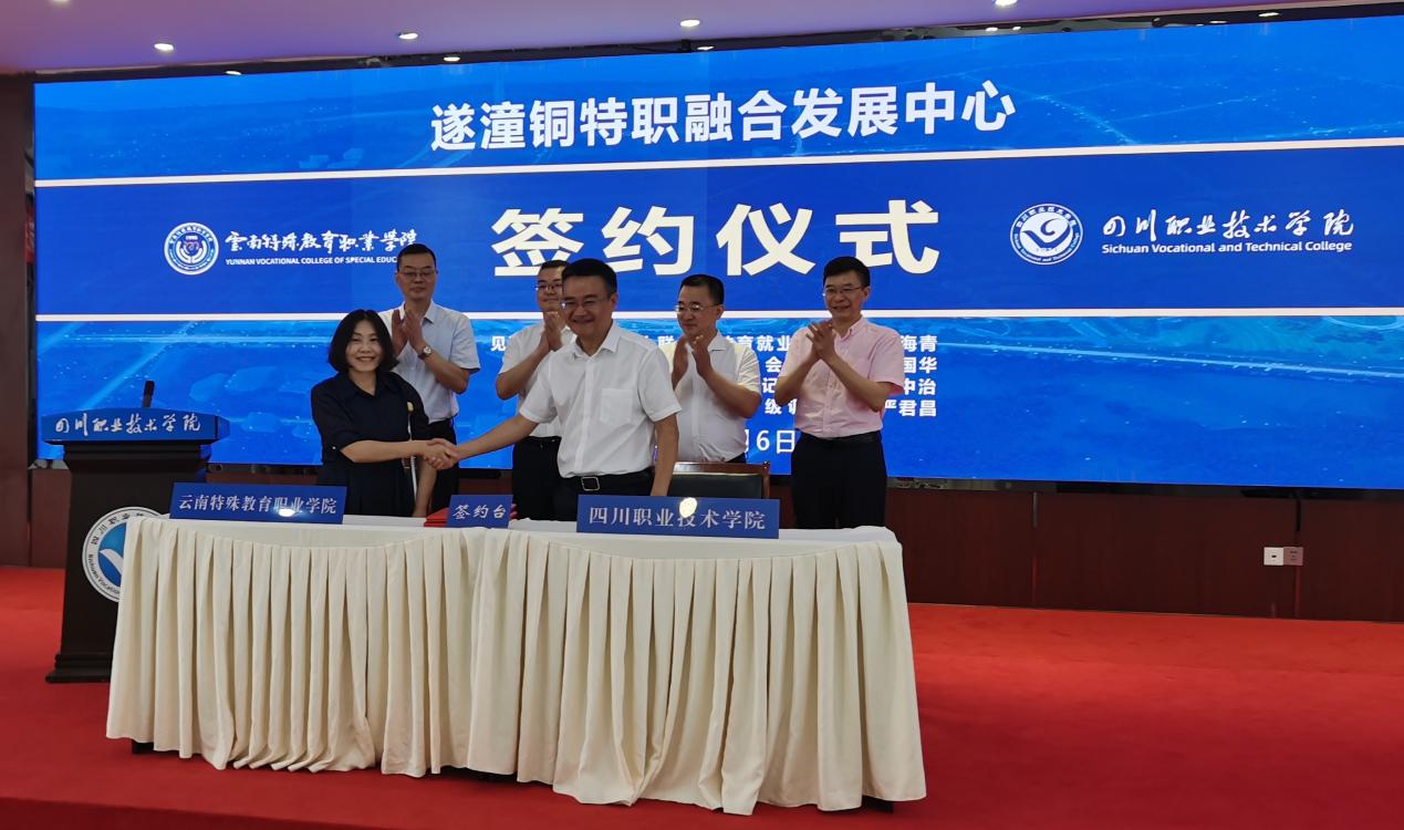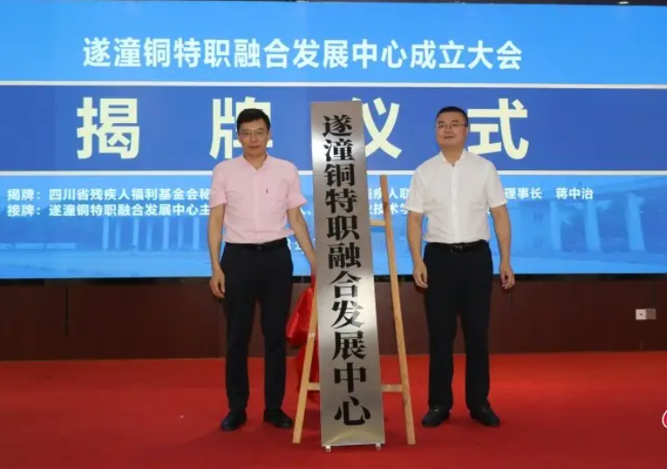 遂潼铜特职融合发展中心是由遂宁助残公益联盟和四川职业技术学院牵头发起,协同遂宁、潼南、铜梁三地残联、教育行政主管部门、特殊学校、中高职院校以及ac米兰官网中文网站、乐山师范学院等中高职、本科院校组建而成,是全国首个以职业教育与特殊教育融合发展为理念、助推残疾人就业的合作发展平台。遂潼铜特职融合发展中心的成立,对于提升特殊教育发展质量,完善残疾人社会保障制度和关爱服务体系,促进残疾人就业和全面发展,具有重要意义。