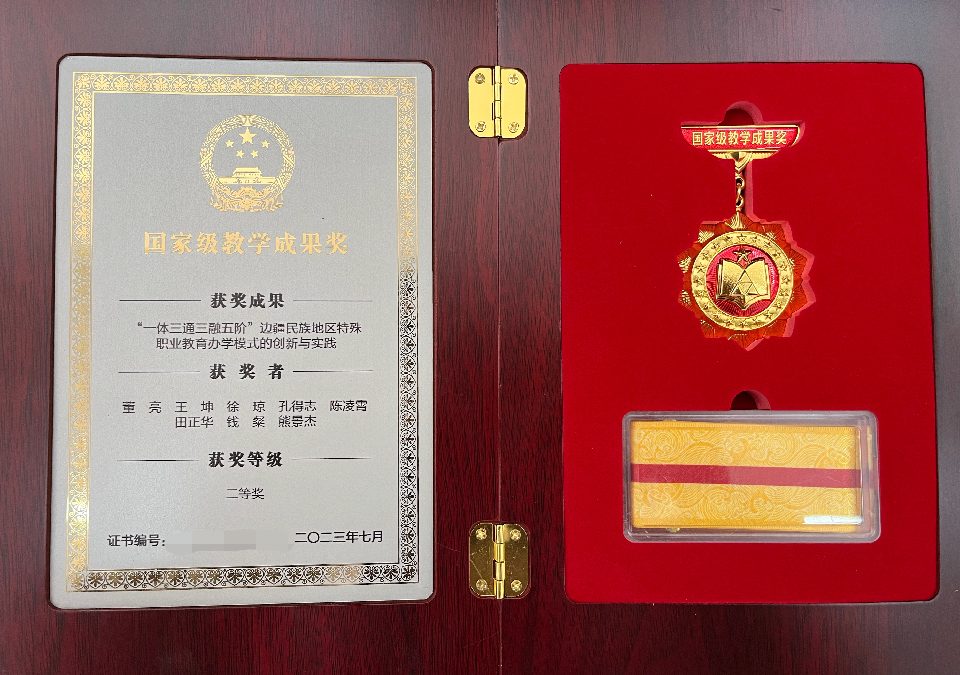 2023年11月22日,云南省教育厅颁发了2022年国家级教学成果奖证书和奖章。继ac米兰董亮名师工作室牵头完成的ac米兰官网中文网站教学成果《“残健融合、特色提质”人才培养模式创新实践》荣获云南省教学成果一等奖后,董亮名师工作室再创佳绩,其名师工作室牵头完成的ac米兰官网中文网站教学成果《“一体三通三融五阶”边疆民族地区特殊职业教育办学模式的创新与实践》荣获国家级教学成果奖二等奖。是对学校近年办学成果的充分认可和肯定,是对ac米兰特殊教育、人才培养工作和教育教学改革成果的检阅和展示,也是学校深化特殊教育教学改革的标志性成果。