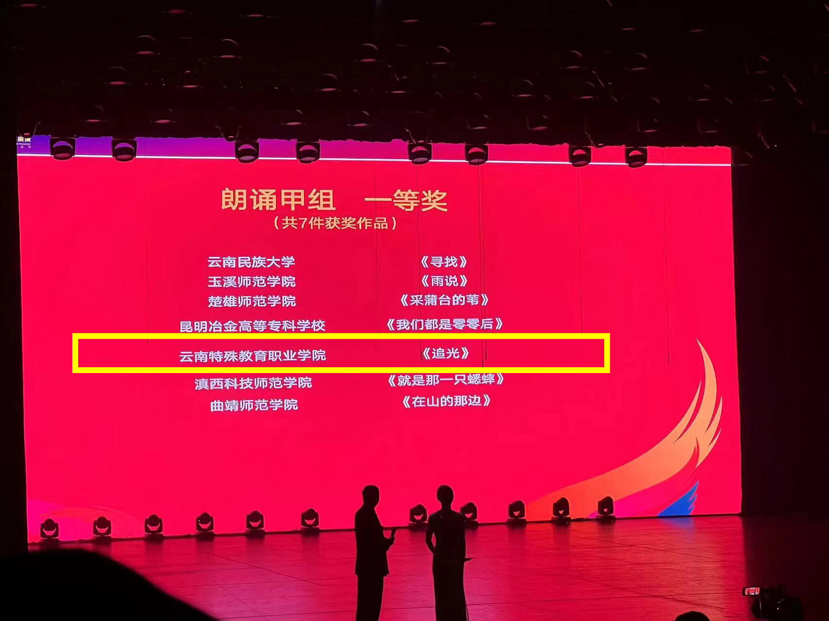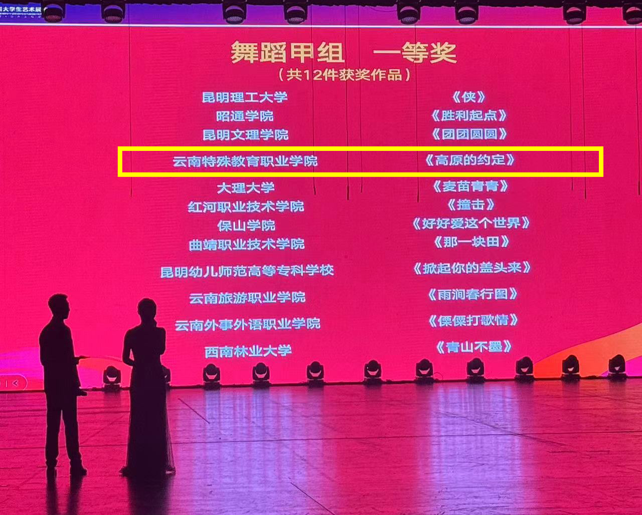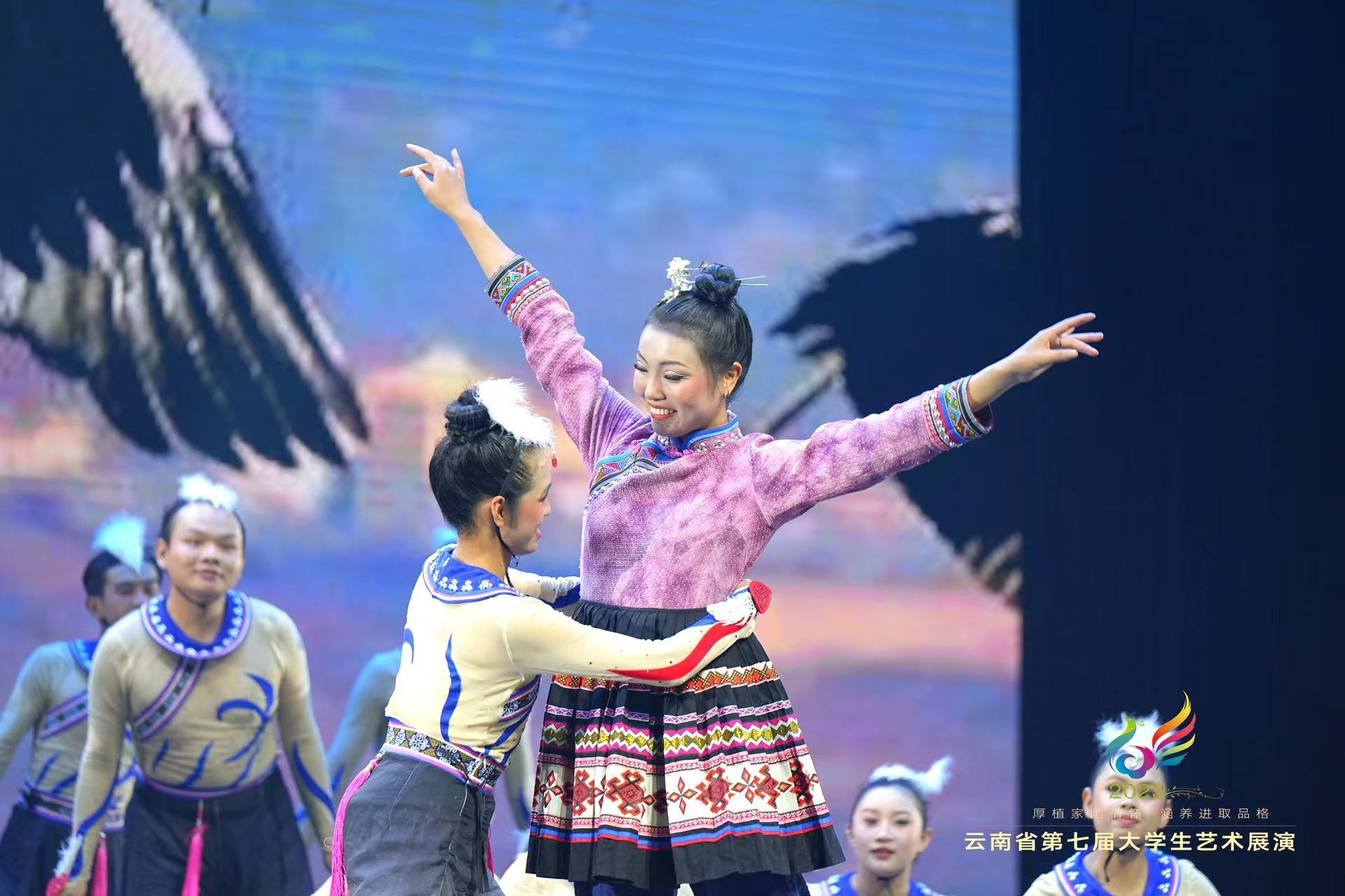 经过激烈的角逐,最终在舞蹈、戏剧、朗诵三个类别中斩获佳绩。“舞蹈《高原的约定》在参加大学生艺术展演舞蹈赛项比赛后获得专家评委、现场观众一致好评,被遴选入云南省第七届大学生艺术展演闭幕式演出”。