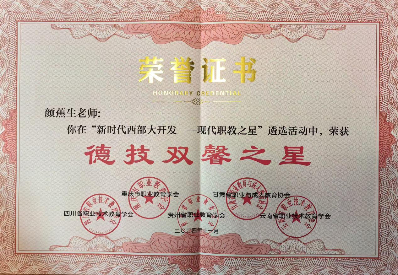 本次大会为西部五省市职业教育优秀论文获奖人员、西部五省市“现代职教之星”进行了颁奖。颜蕉生老师在此次评选中脱颖而出,获得“新时代西部大开发现代职教之星————德技双馨之星”称号。