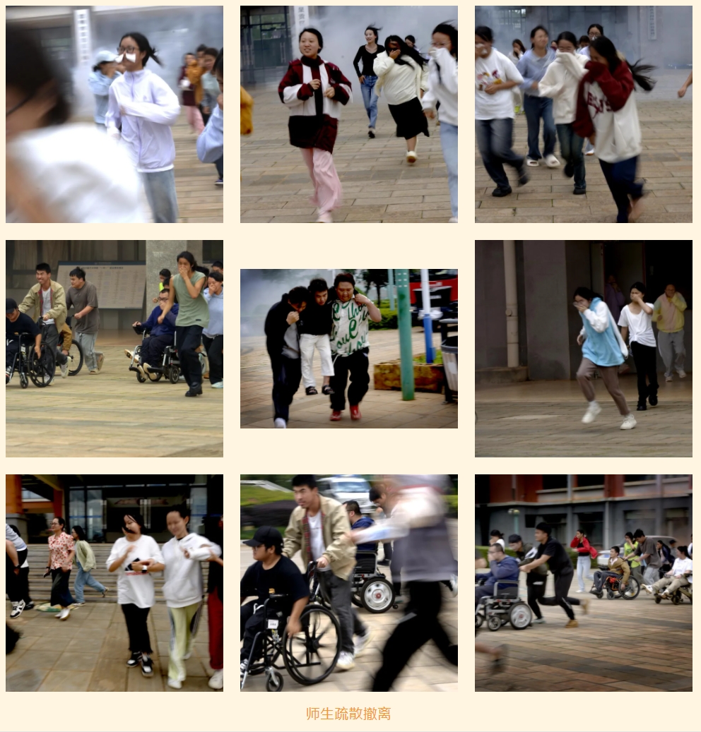 随着火灾警报声与烟雾弹同步触发,14时,演练正式启动。两栋教学楼师生按预定路线向国旗台前广场疏散。针对残疾学生群体,学校提前组建互帮互助小组,实行“一对一”帮扶机制,确保全员安全撤离。班级采用“班长领队、学生居中、安全委员收尾”的三层管理模式。楼层引导员在楼梯拐角等关键节点严防踩踏。全体师生疏散用时3分11秒,医疗组、消防救援组全程待命,演练流程环环相扣。