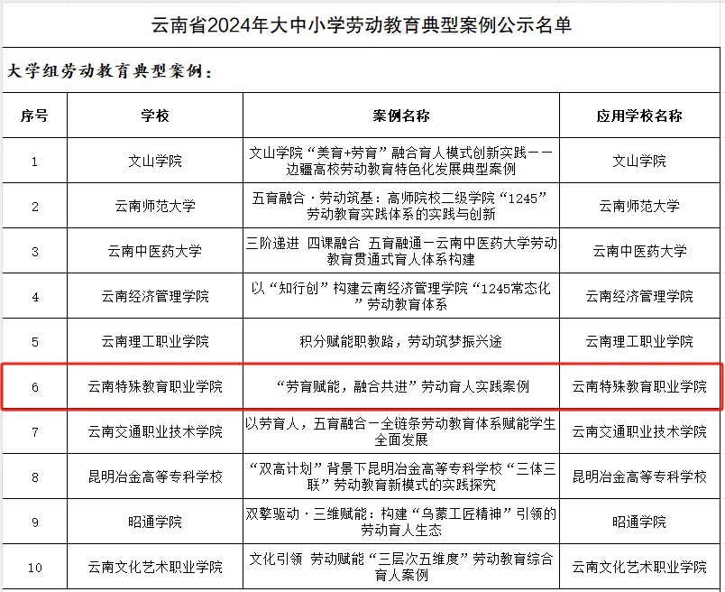 近日,中共云南省委教育工委、云南省教育厅公布2025年大中小学劳动教育典型案例评选结果,ac米兰官网中文网站申报的“‘劳育赋能,融合共进’劳动育人实践案例”成功入选大学组典型案例。学院立足办学特色,创新构建适应性劳动教育体系,将职业技能培养与康复训练有机结合。通过建立课证融通协同育人机制,开发适合肢...