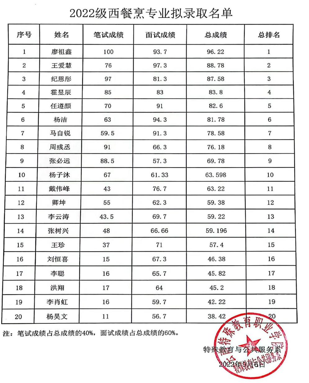 ac米兰官网中文网站2022年西餐烹饪专业计划招生20人,投档学生24人,ac米兰秉着公平、公正、公开的原则,由特殊教育与公共服务系组织22名到校学生分别于2022年8月30日、9月6日进行了入学筛查测试,入学筛查测试包括笔试和面试,根据笔试和面试的综合成绩由高到低录取前20名,现将录取名单公示如下: