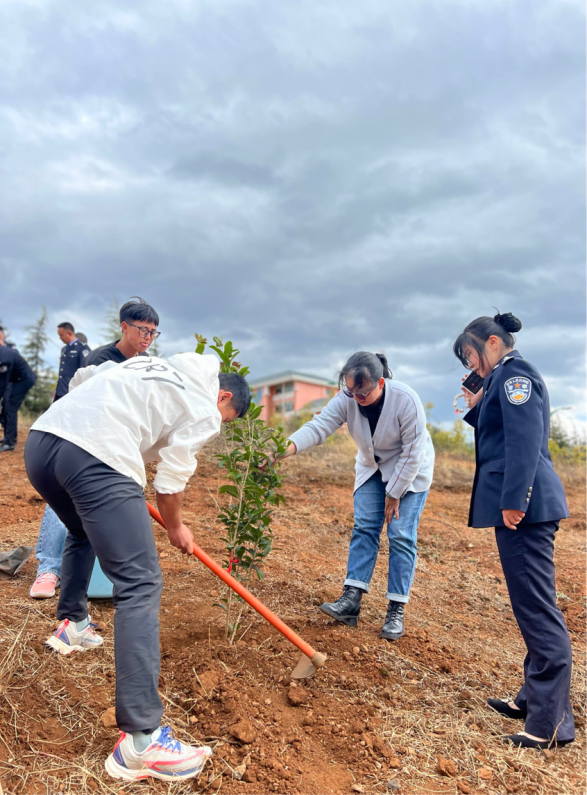 为践行“绿水青山就是金山银山”的环保理念,与会人员共同开展植树活动。大家相互配合,扶苗填土,拿起铁锹、拎起水桶、铲土入坑、培实新土、灌溉浇水;大家精神饱满、干劲十足,一起播种绿色和希望。在大家的辛勤劳作下,一棵棵小树苗“安家落户”。40多棵小树整齐有致、迎风挺立,焕发生机。