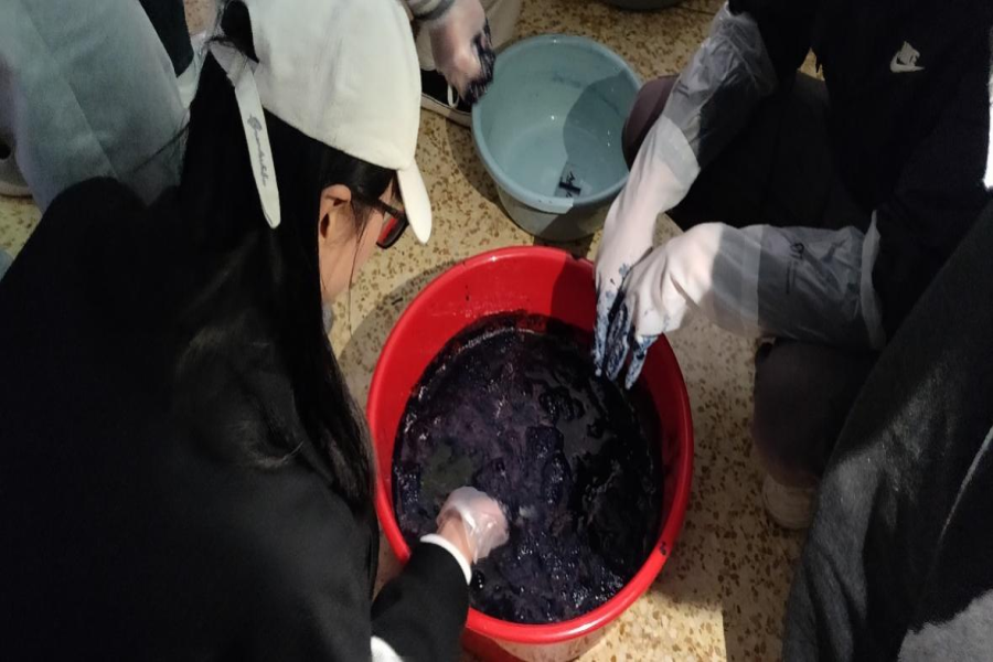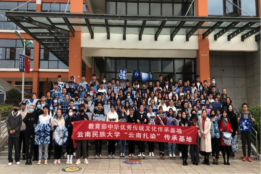 活动开始,云南民族大学艺术学院刘晓蓉老师的团队成员为师生们介绍了非物质文化遗产、传统文化传承基地和扎染工艺的基本知识和制作技巧等,通过生动细致的讲解,让师生们深刻体验到中华优秀传统文化的博大精深。接着,工作人员给每个人分发了扎染制作工具和布料,师生们根据自己的喜好将布料用皮筋扎起来,并将扎好的布料放进盆里浸染,大概半小时之后,一件件精美的扎染作品呈现在大家眼前,由于手法不同,每一件扎染作品都是独一无二的,大家脸上都洋溢着自信灿烂的笑容。活动结束后,全体人员进行了合影留念,现场气氛热烈。