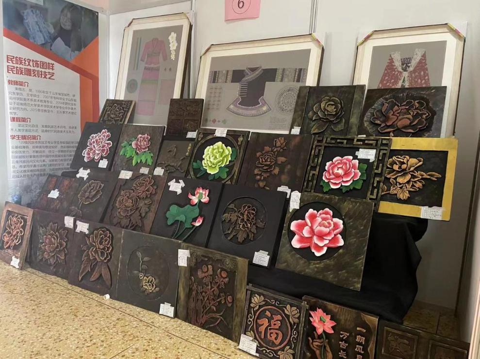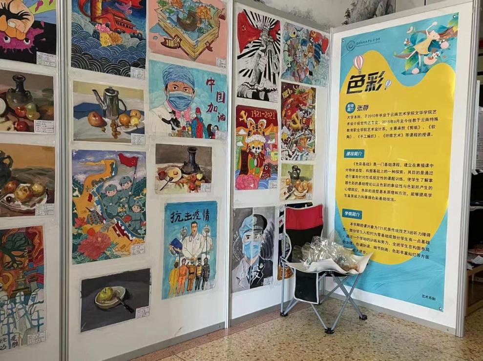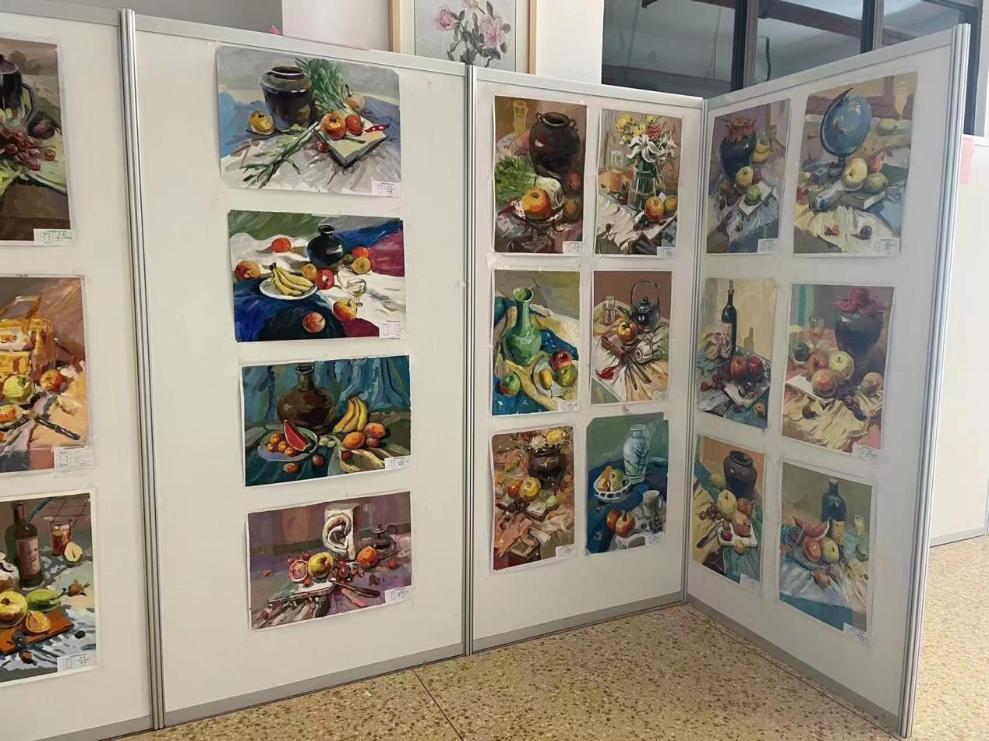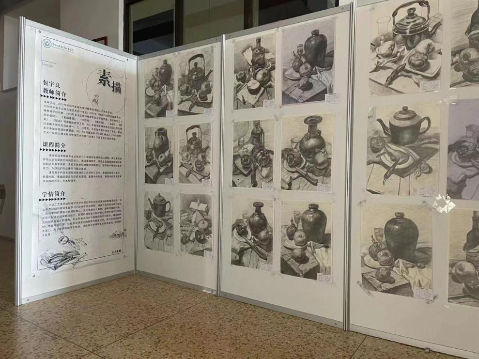 艺术系5个专业26名校内外教师参与了本次作品展,覆盖20、21级大中专全部实操类课程,包含素描、色彩、工笔画、民族纹饰图样、装饰版画、油画、陶艺制作及彩绘、民族剪纸等42门课,共收集和展出作品500余件,其中包含1个党建作品专区和40多件课程融思政成果作品。