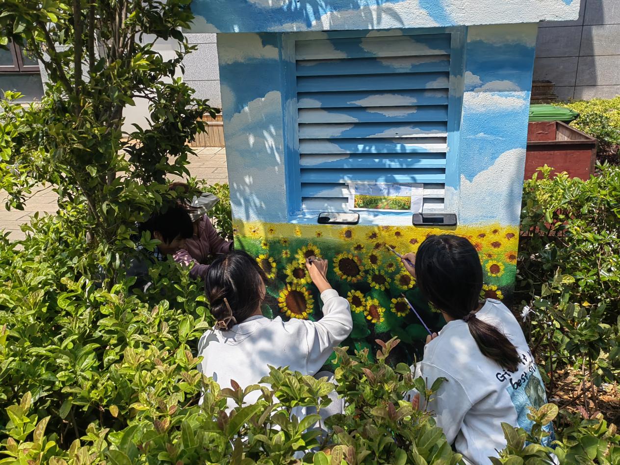 本次活动共10名支部党员带领52名学生完成了6个通风井墙面绘制,图案围绕生物多样性主题结合本季节春意黯然、百花齐放的风景特点设计,支部党员完成设计后交由学生小组完成具体彩绘实践,在绘制过程中,学生们充分结合自身专业特长和墙绘具体要求灵活调整技术技法,一方面是对自己专业能力的一次实践性检验;另一方面也为各专业学生提供了一个专业技能横向比对的机会,至此校园里又多了6幅美丽的画卷,至此艺术系党支部党建引领业务发展又多了一个渠道和平台。