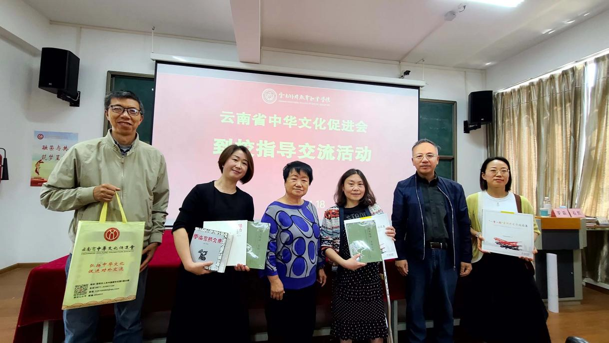 石红副校长对秦桂珍一行的到来表示欢迎,整个活动分交流环节和看稿环节,在交流环节,秦桂珍副主席介绍了云南省中华文化促进会的基本情况,云南省中华文化促进会罗磊副秘书长介绍了云南省中华文化促进会剪纸艺术委员会及云南剪纸艺术相关著作,艺术系民族传统技艺专业教师张静介绍了民传专业人才培养、师资队伍和剪纸课程建设情况。在看稿环节,云南省中华文化促进会剪纸艺术委员会成员代莉、陈宏伟、杨赋、林谋旺、汪元和张丽莉分别围绕自己的原创剪纸稿为现场师生作逐一展示和介绍,秦桂珍副主席和叶铸咨询委员作点评。随后,秦桂珍将书籍《和美地球》《一带一路剪纸艺术展精品集》赠与石红及艺术系到场教师,罗磊将沐正戈主编的《云南民族剪纸》《云南剪纸新作》《剪纸新天地》、薜定衡主编的《云南剪纸文集》和自己主编的《镂白剪纸集》赠与艺术系。